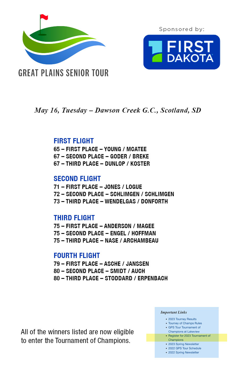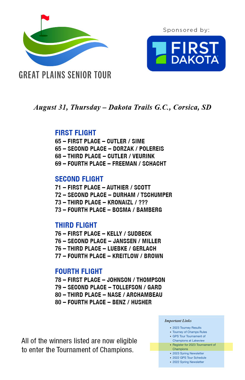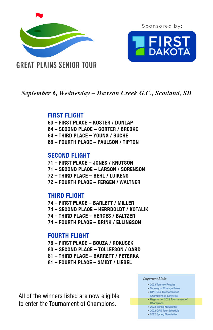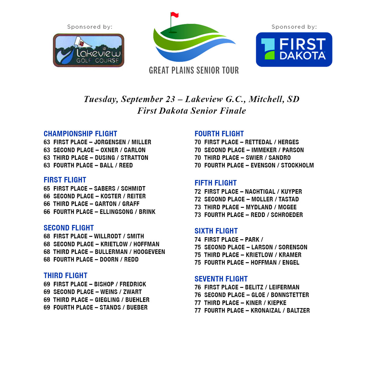 - September 23, Tuesday – Lakeview G.C., Mitchell, SD, 605-995-8460, First Dakota Senior Finale