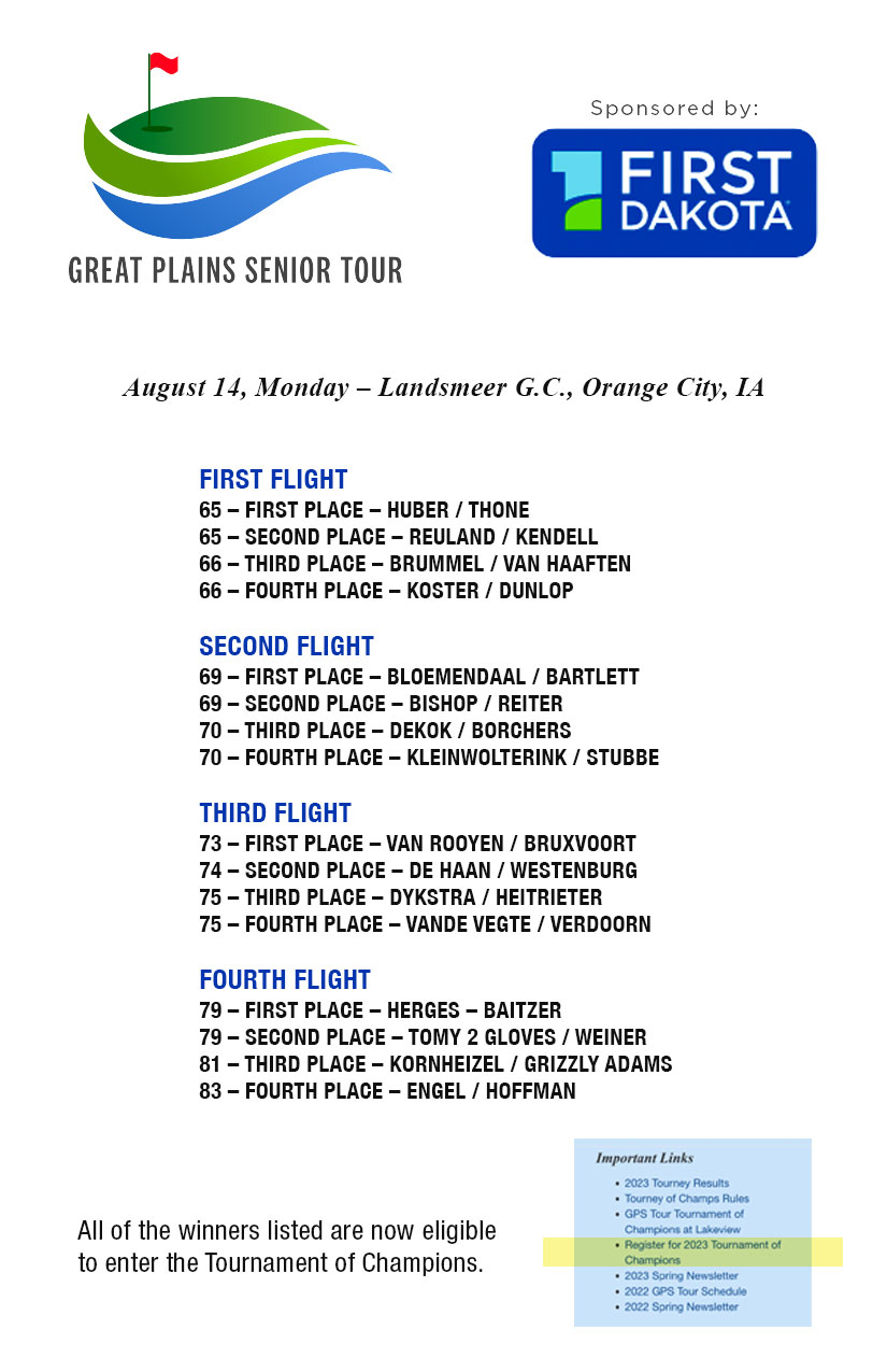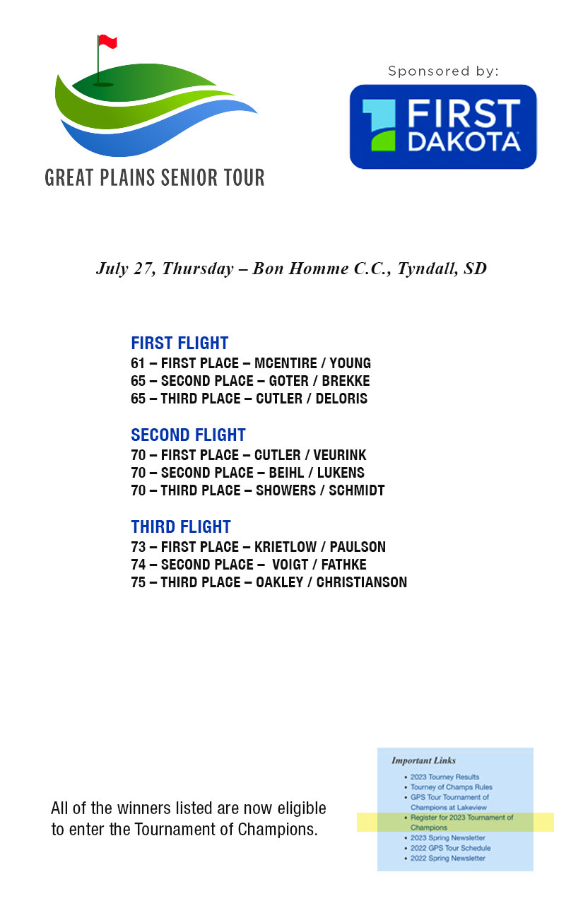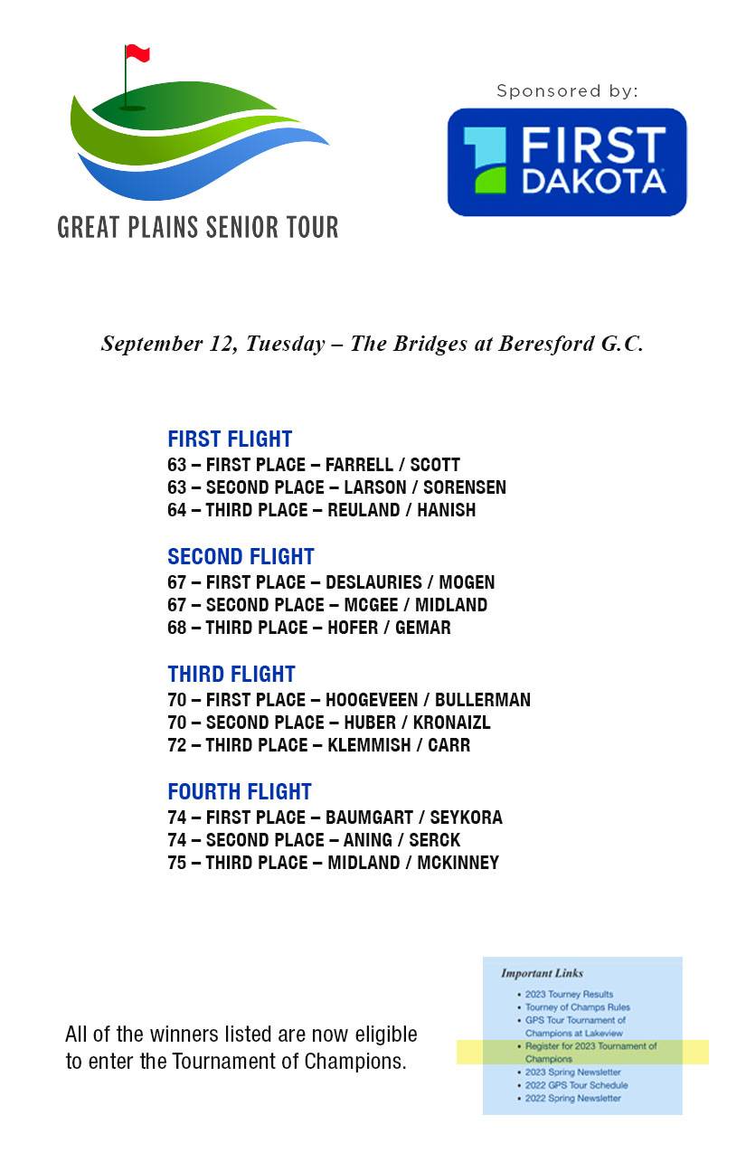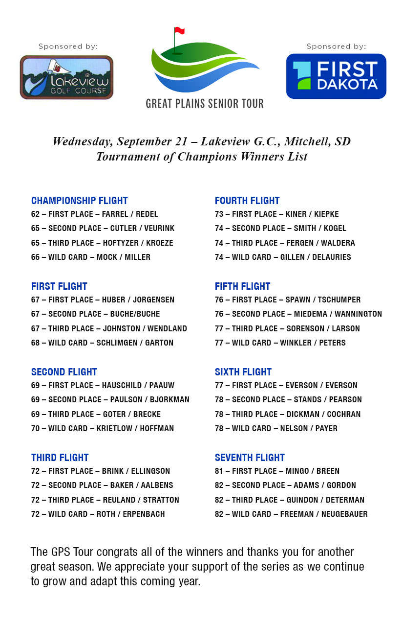 - September 20, Wednesday – Lakeview G.C., Mitchell, SD, Tournament of Champion