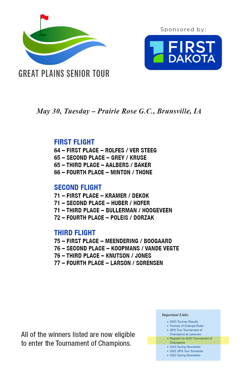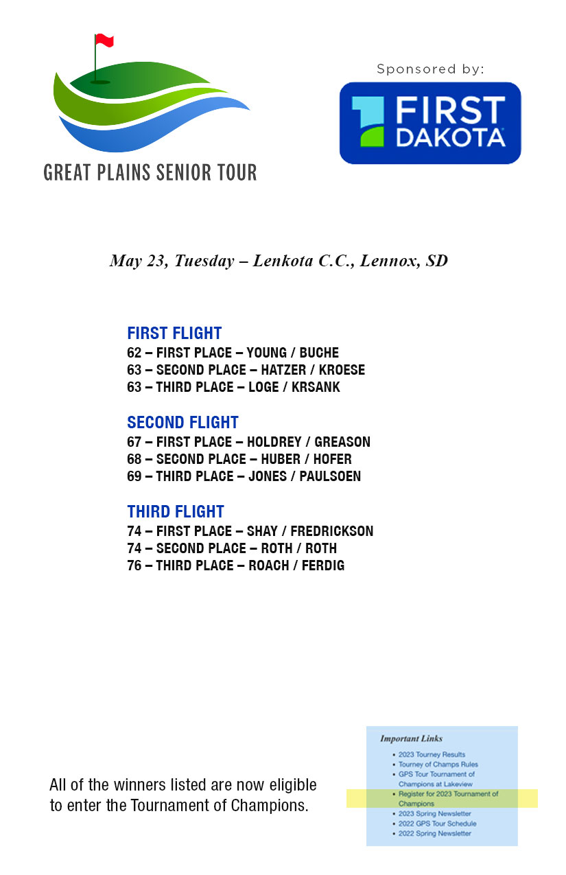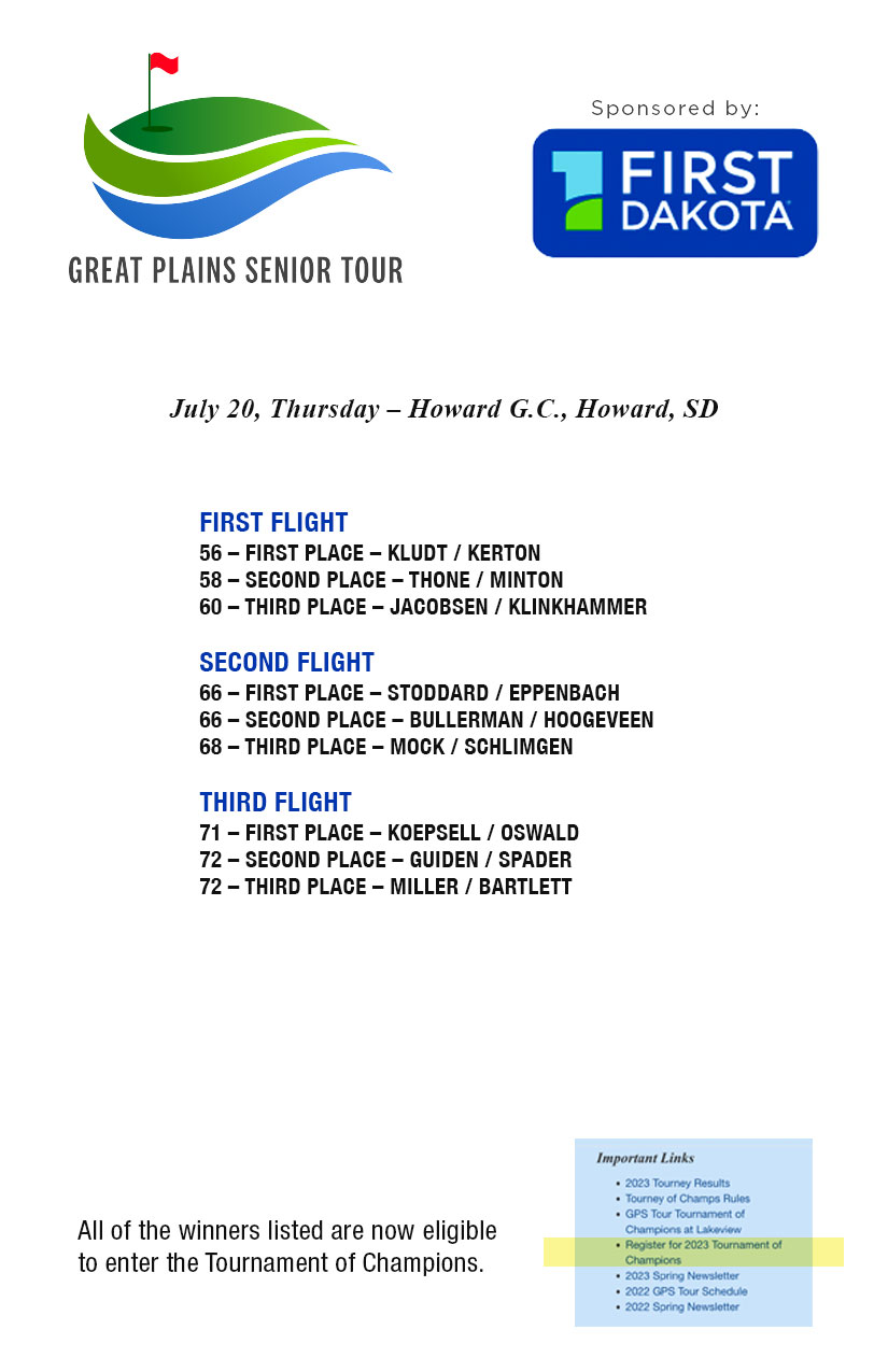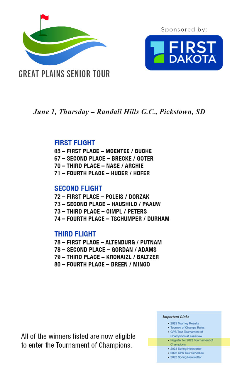 - September 20, Wednesday – Lakeview G.C., Mitchell, SD, Tournament of Champion