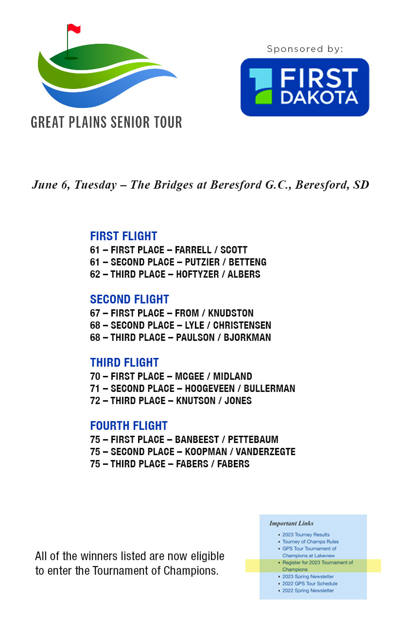 - June 6, Tuesday – The Bridges at Beresford G.C., Beresford, SD