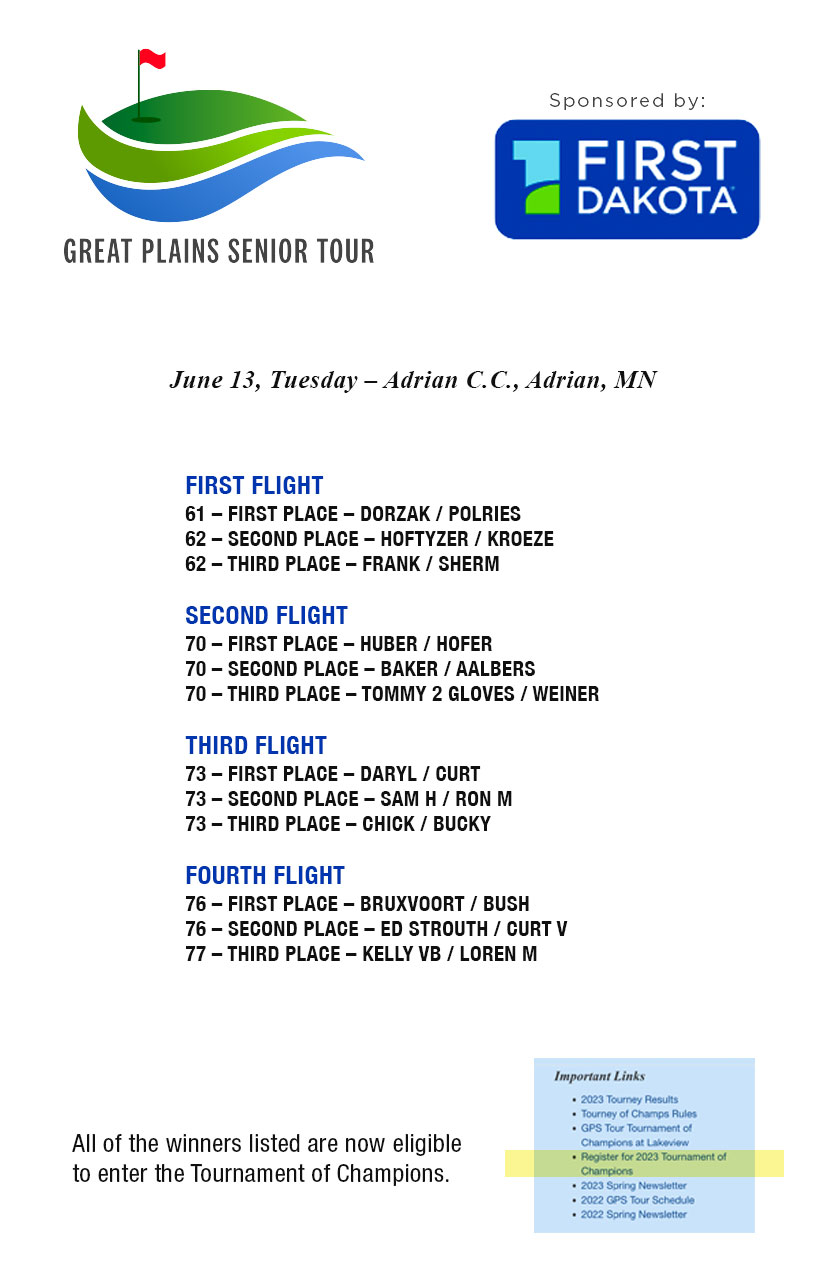 - June 13, Tuesday – Adrian C.C., Adrian, MN