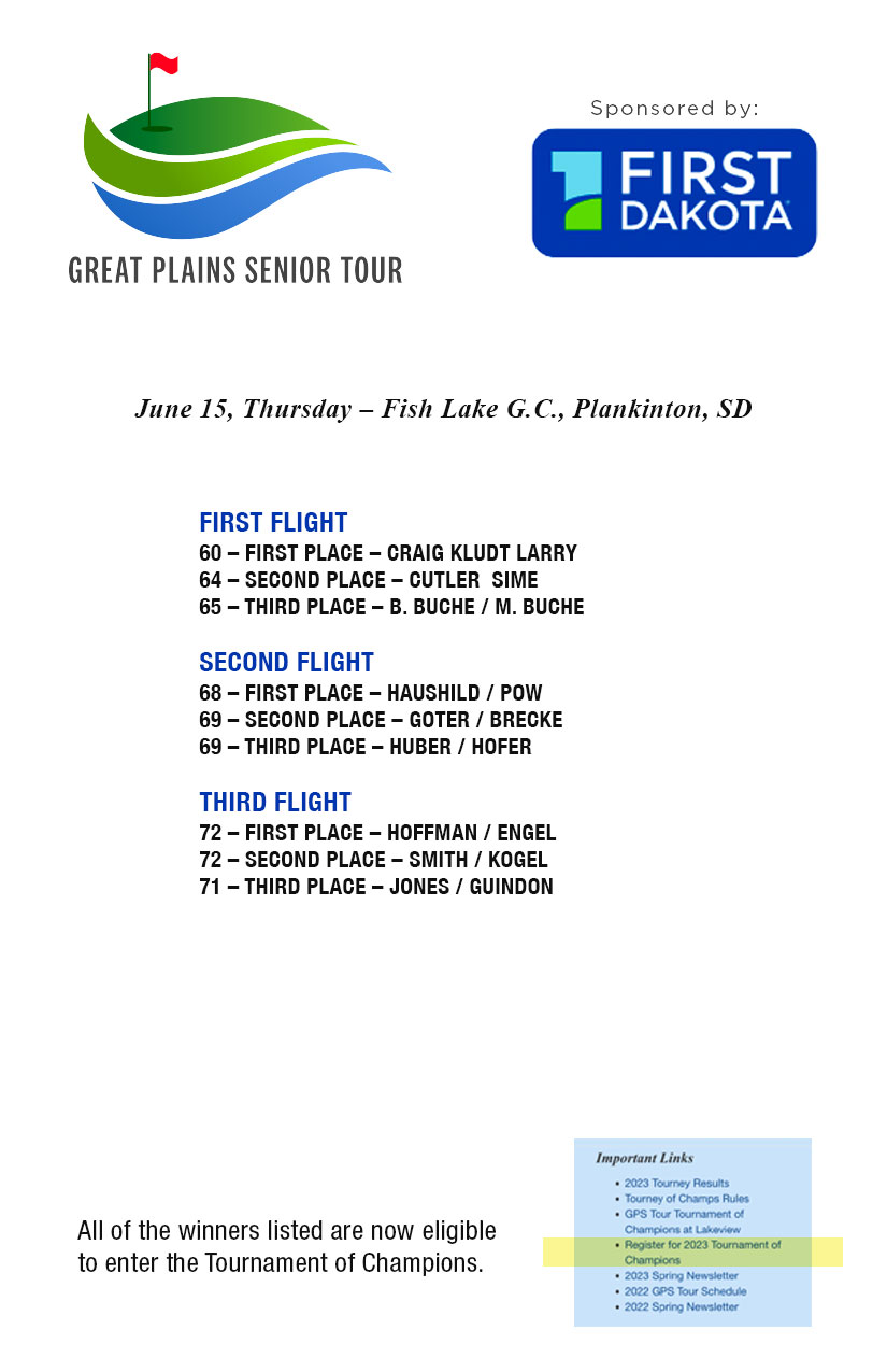 - June 12, Thursday – Fish Lake G.C., Plankinton, SD, 605-942-7269