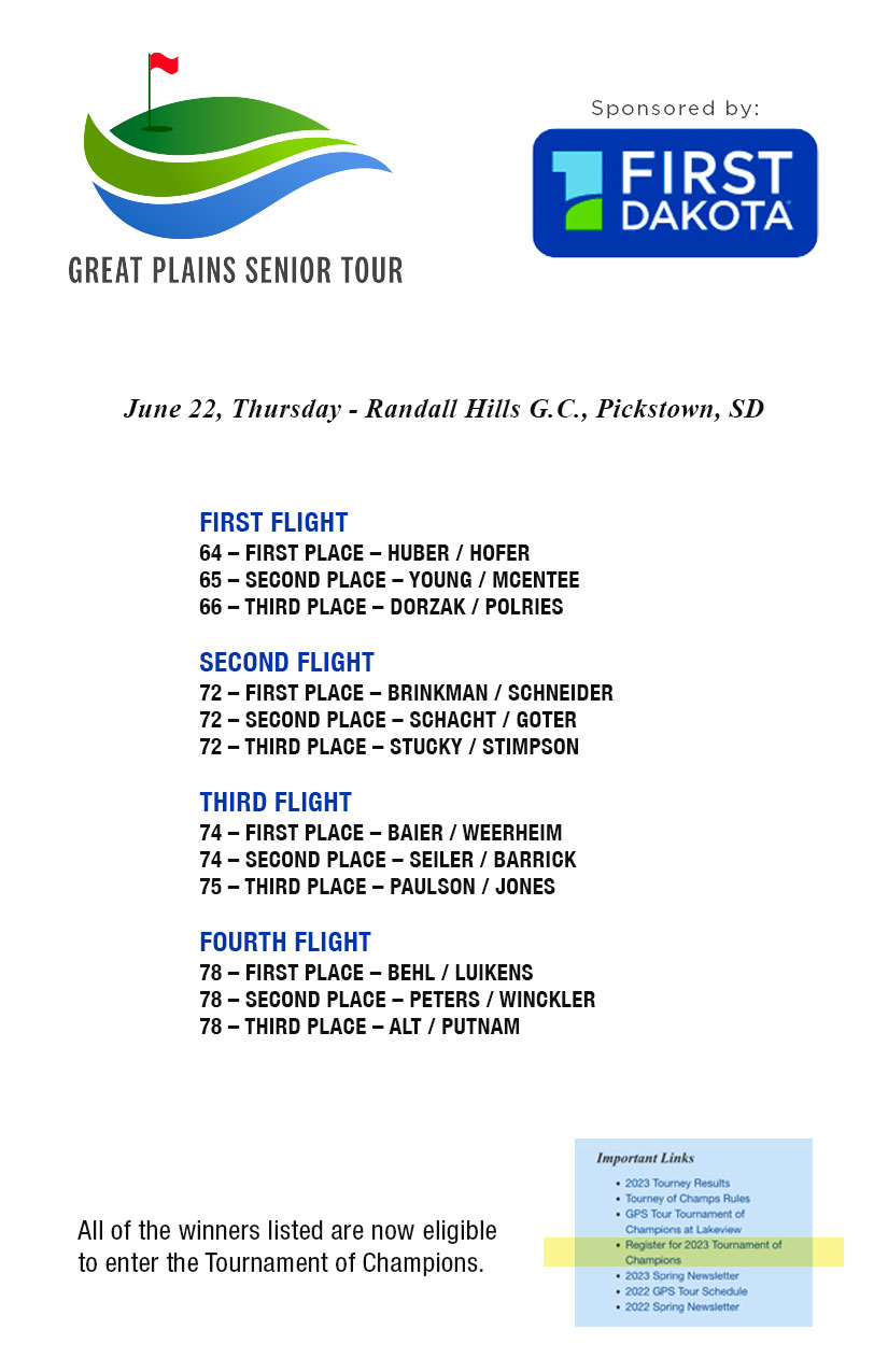 - June 19, Thursday – Randall Hills G.C., Pickstown, SD, 605-487-7884