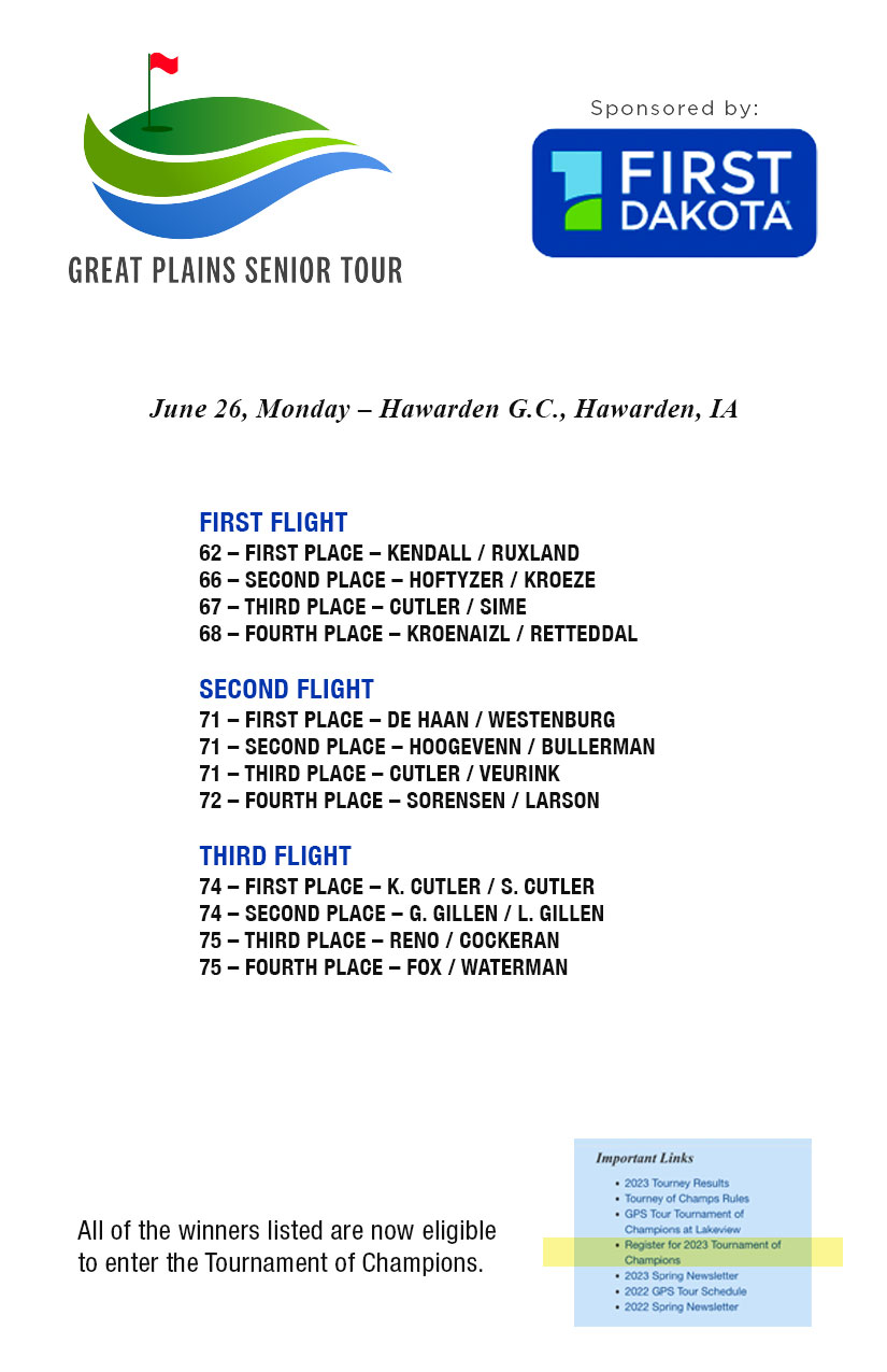 - June 23, Monday – Hawarden G.C., Hawarden, IA, 712-551-4444