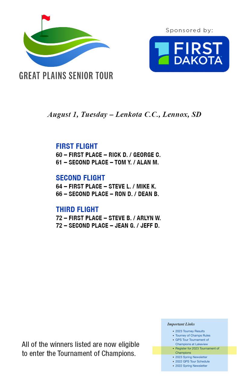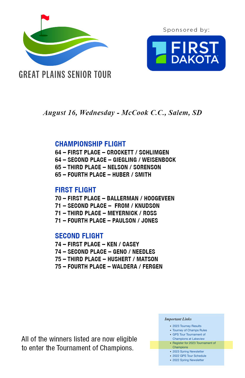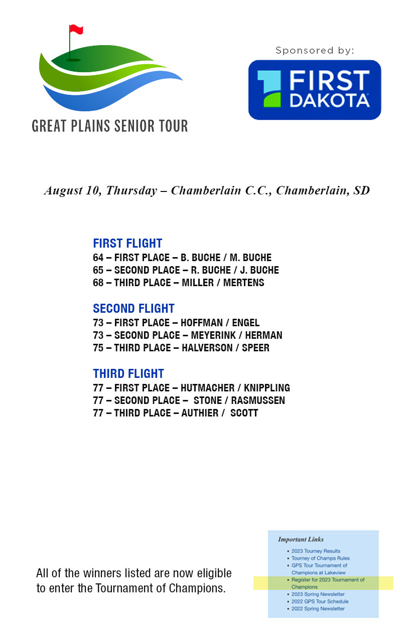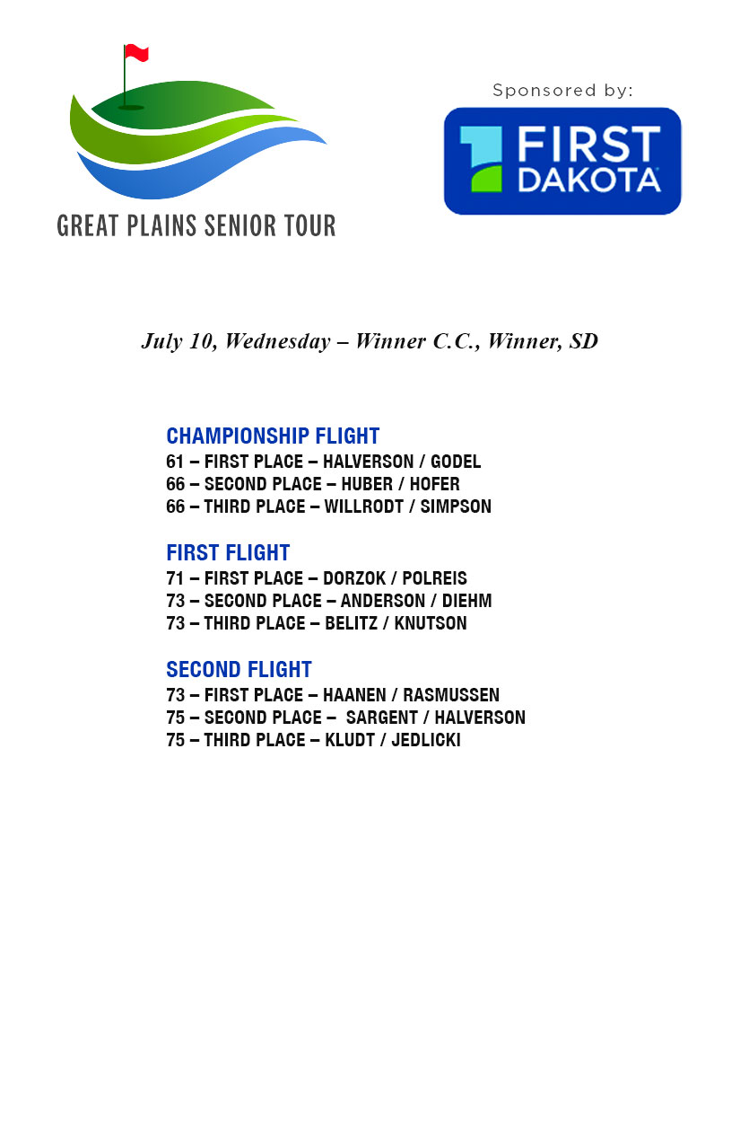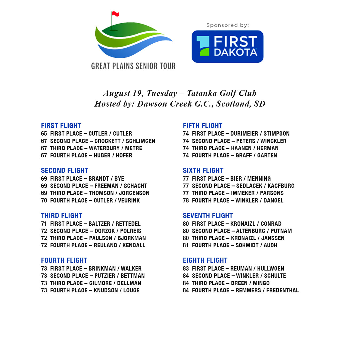 - August 19, Tuesday – Host: Dawson Creek G.C., Scotland, SD, 605-583-4244 (held at Tatanka G.C. in Niobrara, NE)