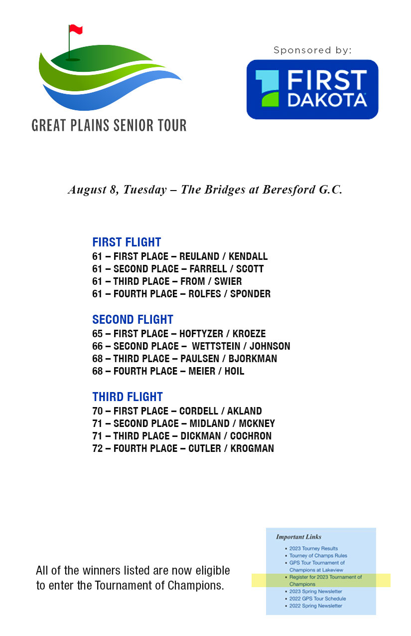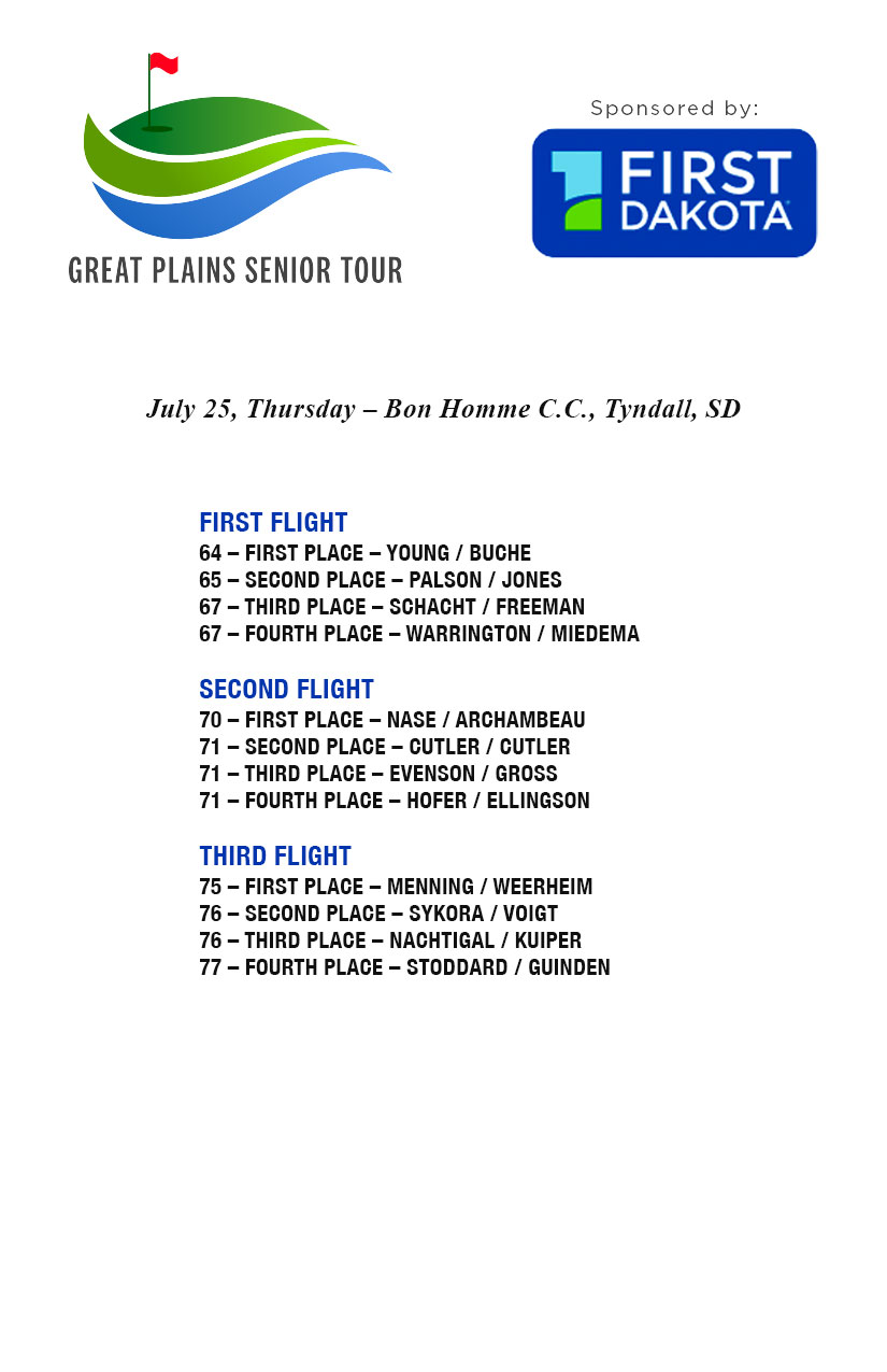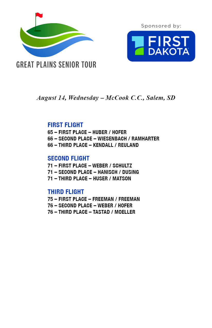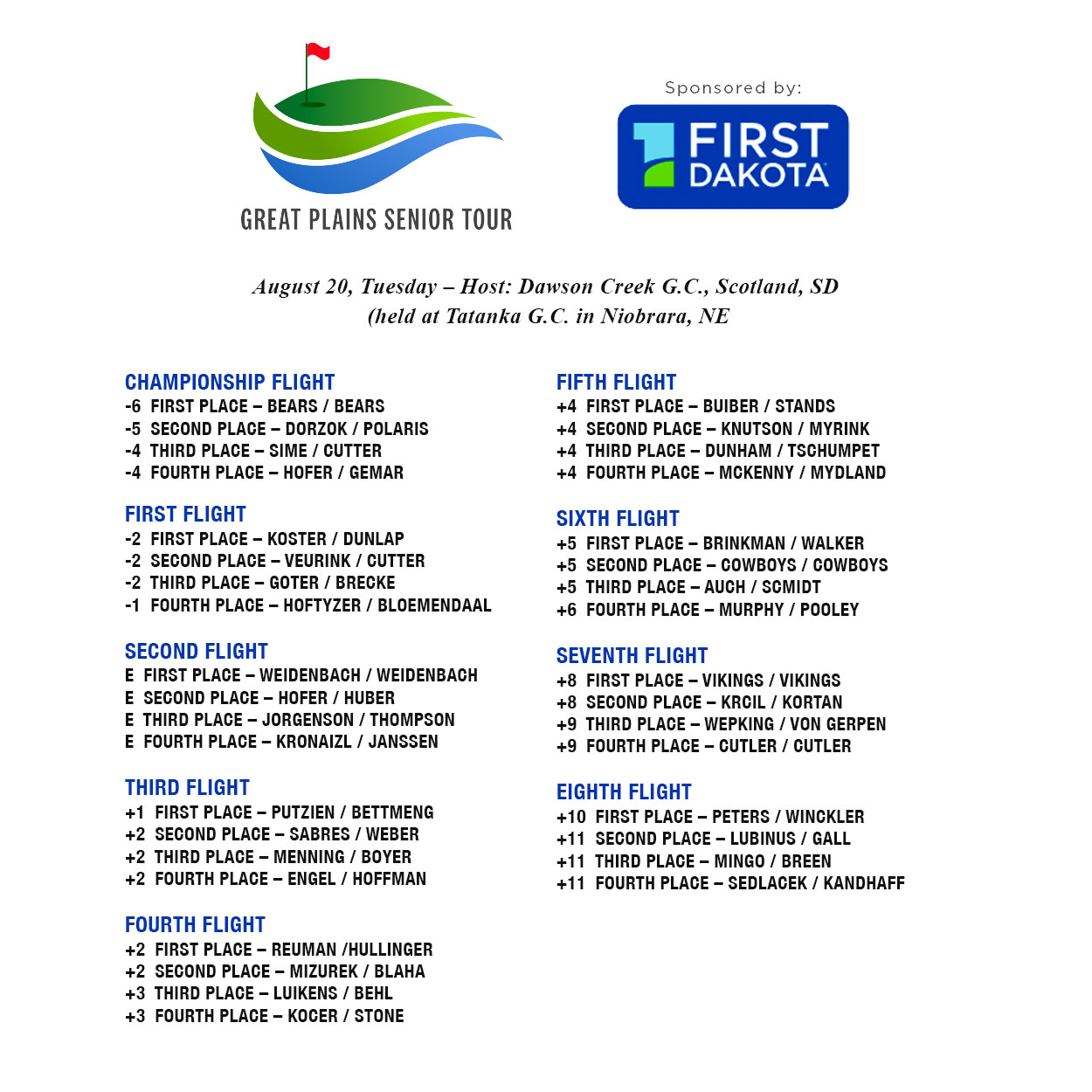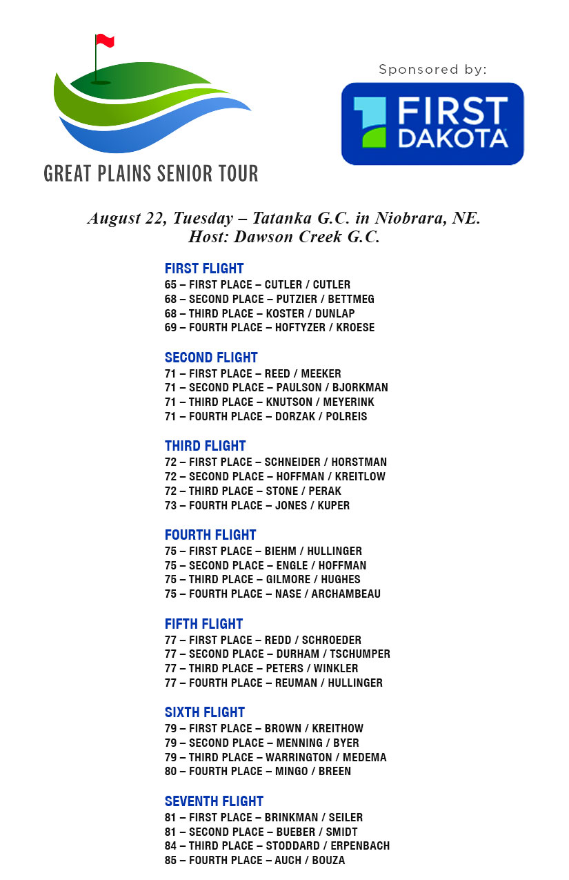 - August 20, Tuesday – Host: Dawson Creek G.C., Scotland, SD, 605-583-4244 (held at Tatanka G.C. in Niobrara, NE)