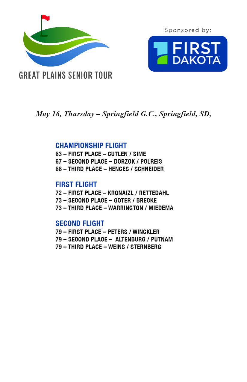 - May 16, Thursday – Springfield G.C., Springfield, SD, 605-369-5525