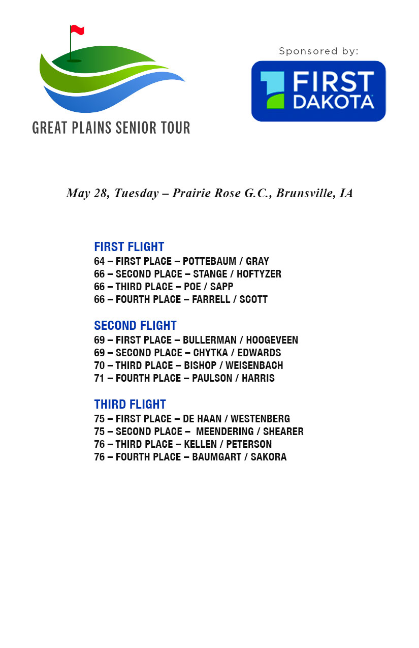 - May 28, Tuesday – Prairie Rose G.C., Brunsville, IA, 712-533-6774