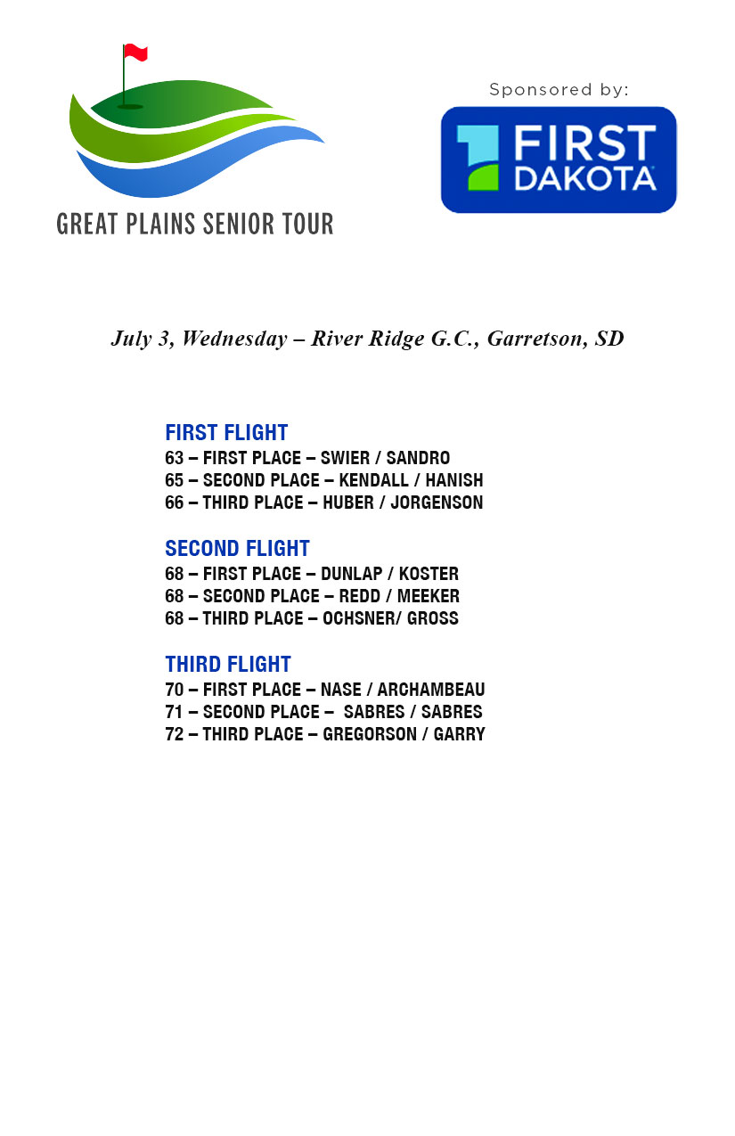 - July 3, Wednesday – River Ridge G.C., Garretson, SD, 605-594-6234