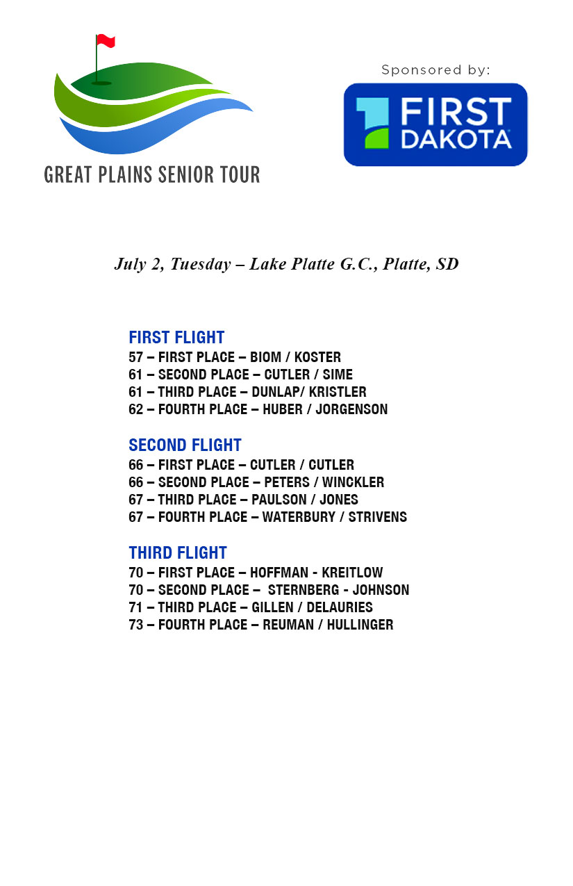 - July 2, Tuesday – Lake Platte G.C., Platte, SD, 605-337-3300