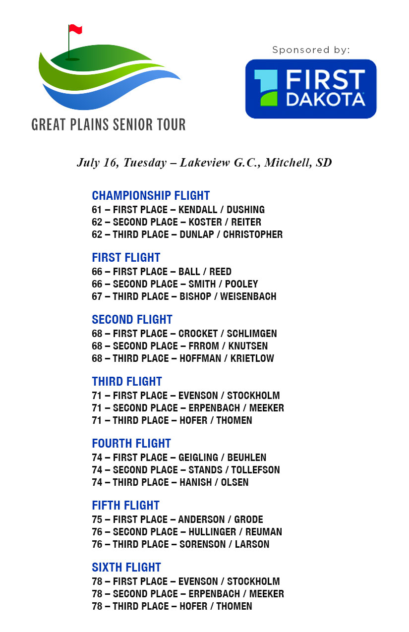 - July 16, Tuesday – Lakeview G.C., Mitchell, SD, 605-995-8460