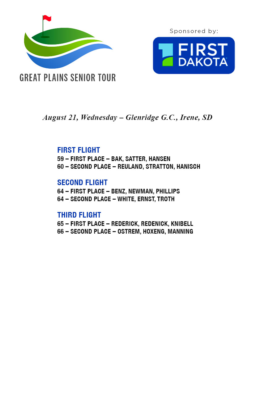 - August 21, Wednesday – Glenridge G.C., Irene, SD, 605-263-3546 - Note this is a 3-Man Scramble