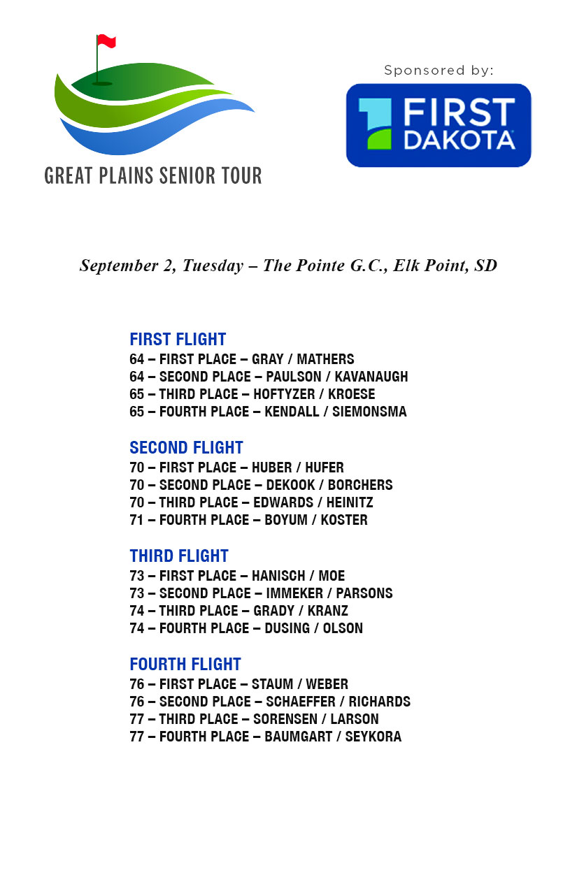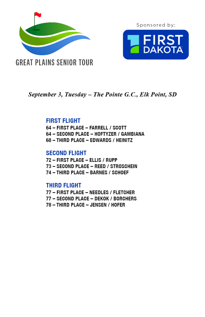 - September 2, Tuesday – The Pointe G.C., Elk Point, SD, 605-356-2874