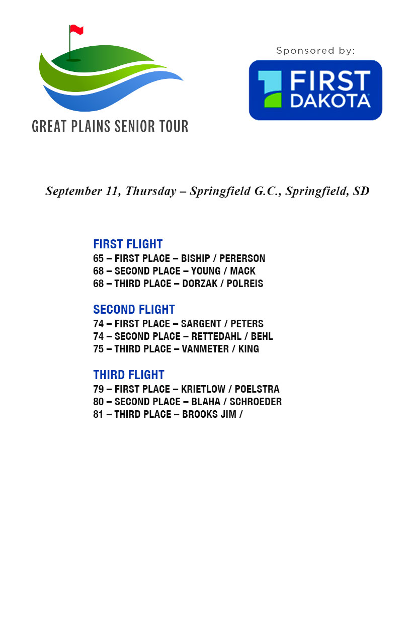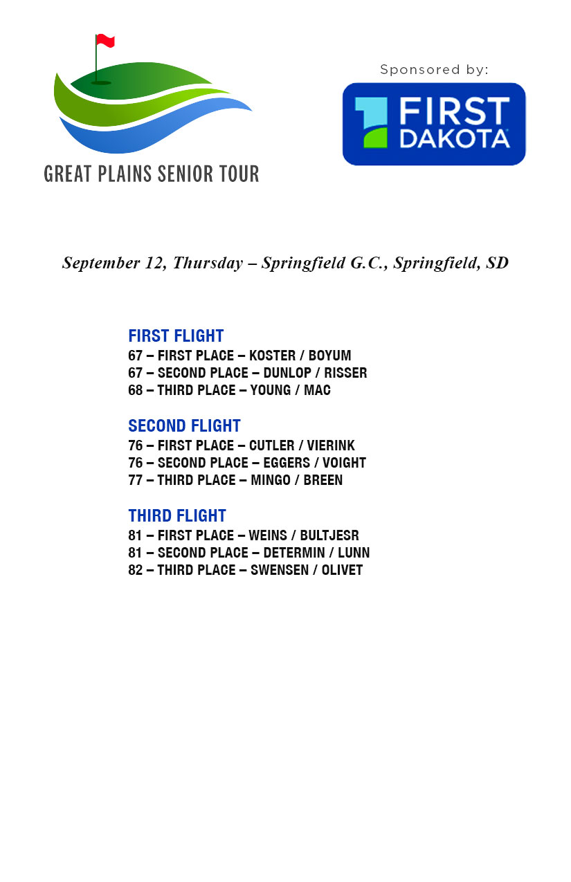 - September 12, Thursday – Springfield G.C., Springfield, SD, 605-369-5525