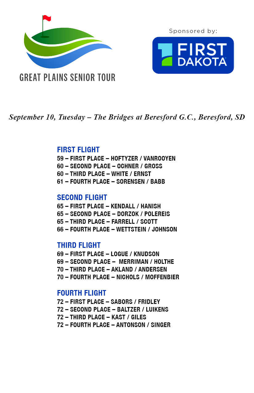 - September 10, Tuesday – The Bridges at Beresford G.C., Beresford, SD, 605-763-2202