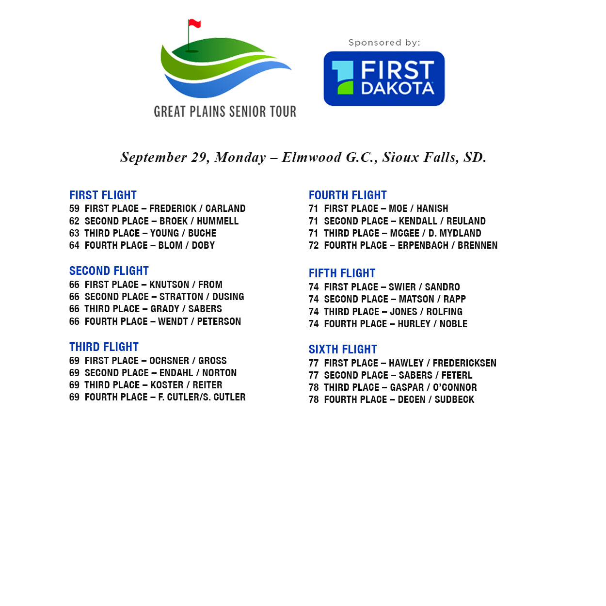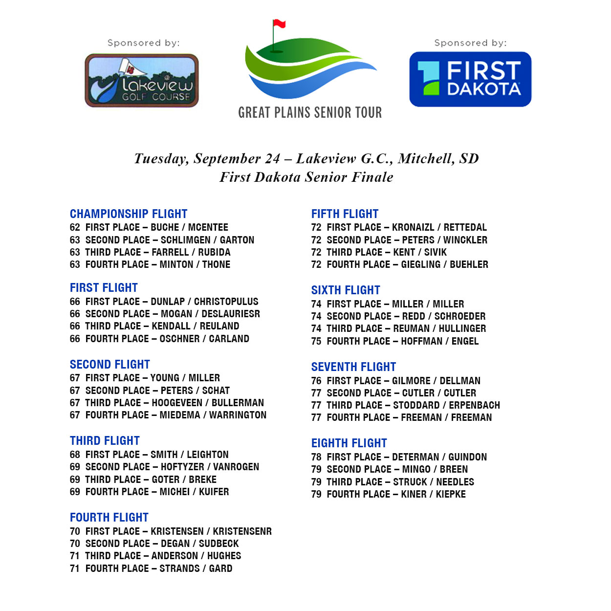 - September 24, Tuesday – Lakeview G.C., Mitchell, SD, 605-995-8460, First Dakota Senior Finale (weather date Wednesday, September 25)