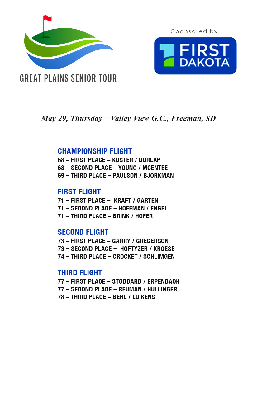 - May 29, Thursday – Valley View G.C., Freeman, SD, 605-925-4929