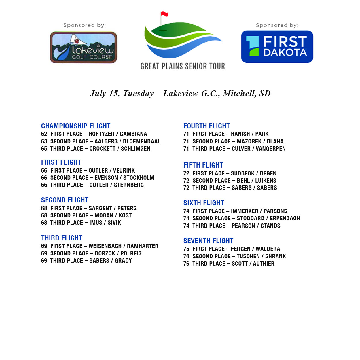 - July 15, Tuesday – Lakeview G.C., Mitchell, SD, 605-995-8460
