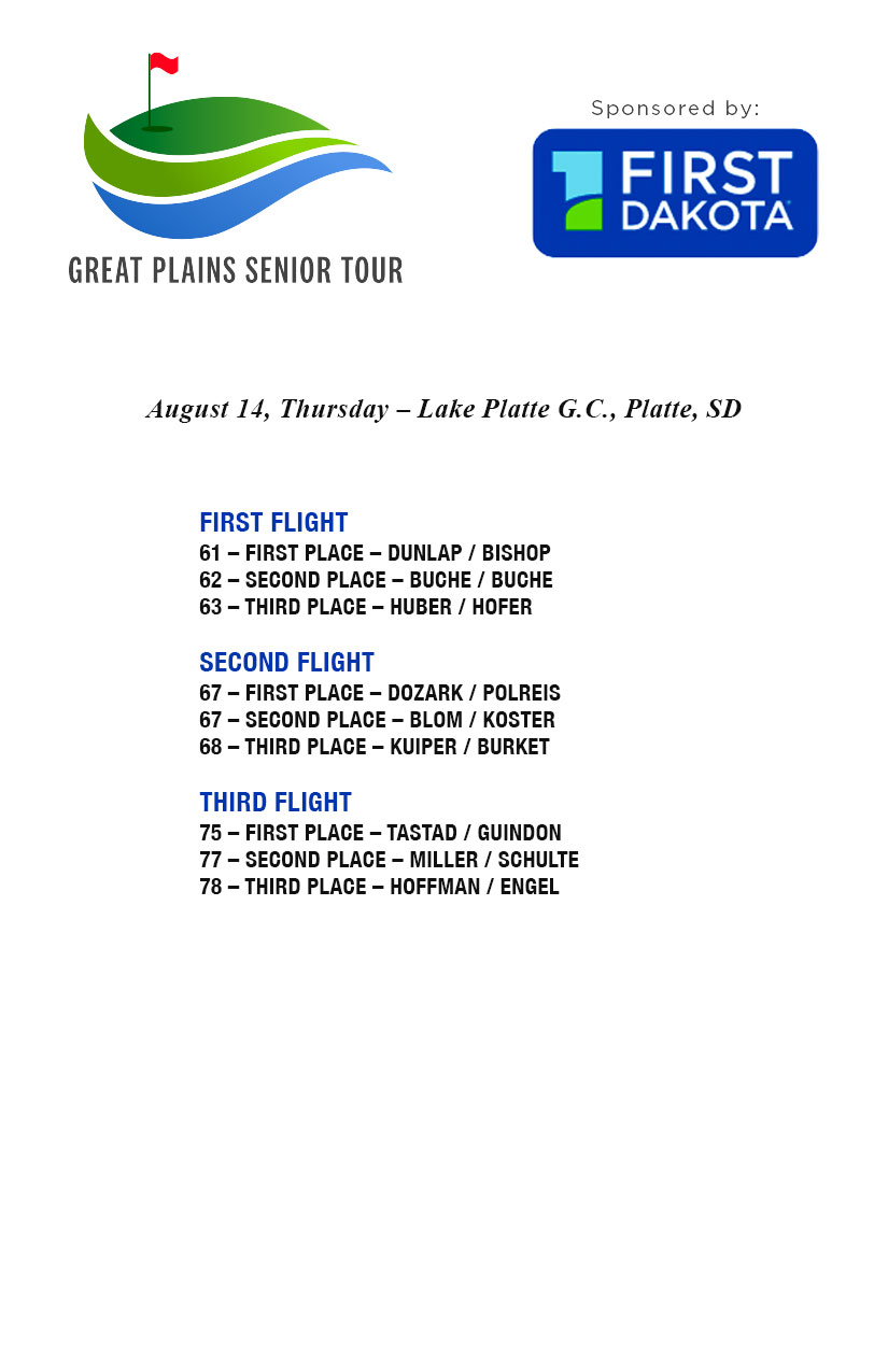 - August 14, Thursday – Lake Platte G.C., Platte, SD, 605-337-3300