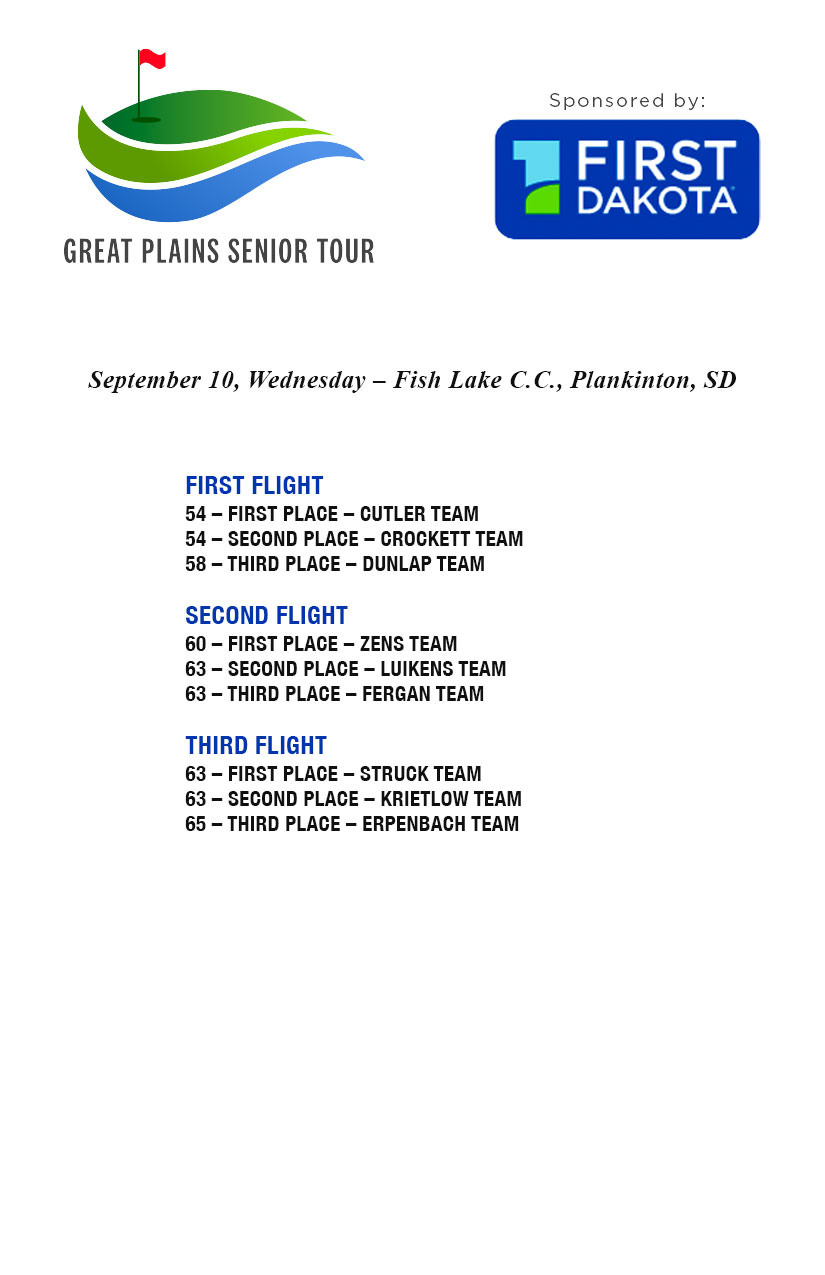 - September 10, Wednesday – Fish Lake C.C., Plankinton, SD, 605-942-7269 - Note this is a 4-Man Scramble
