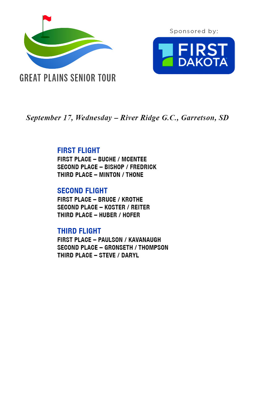 - September 18, Wednesday – River Ridge G.C., Garretson, SD, 605-594-6234