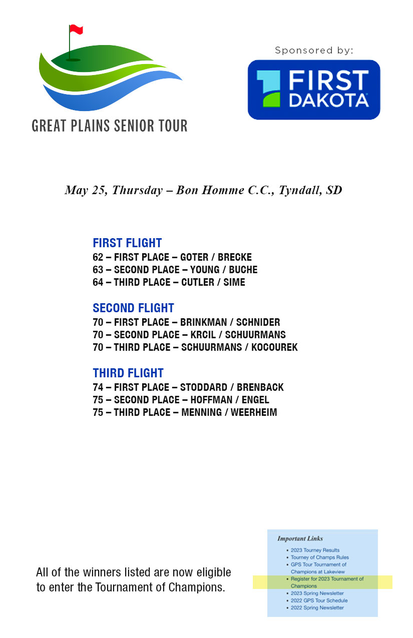- May 23, Thursday – Bon Homme C.C., Tyndall, SD, 605-589-3186